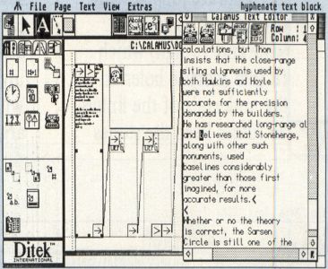 Working with Calamus can prove to be initially bewildering. It uses an icon-based interface, along with the standard GEM menus (and many enhanced-GEM dialog and file selector boxes). Many icons lead to one or more levels of additional icon pads. At the top of the screen, a brief description of the purpose of an icon appears, so you don't need to memorize them all. These messages, by the way, can be changed by any user by editing the text files provided.