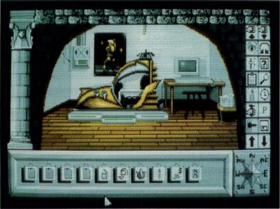 The user interface is really what makes playing Chronoquest enjoyable. There is no need to type in text commands only to have them rejected by a finnicky parser. The game is totally mouse-driven. Two rows of icons frame the right side of each scene. Pointing and clicking on these icons performs the entire range of adventure-type commands, including Take, Drop, Use, Search, Examine, Push, Pull, Up, Down, Turn, Wait, Inventory, Load and Save. Furthermore, there is a compass icon for inputting directions of movement. All the player has to do is click on one of eight points of the compass, and if travel is permitted in that direction, the program takes him/her there.