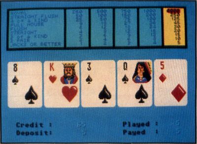 Upon receiving the hand, the player must determine which cards to hold and which to discard. This decision is made by entering the corresponding card number, one through five, of the cards to hold. In deference to the mouse, this method is faster, easier and closer to that used by the machines in Atlantic City. When the space bar is pressed, the cards not chosen to be held are flipped over and replaced. If the remaining hand yields a pair of jacks or better, the player wins. The amount of winnings is reflected by the strength of the hand and the number of coins played, as highlighted at the top of the screen.