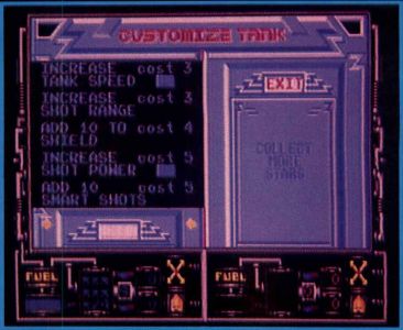 There are a few difficulties, like other tanks out to smash you to bits and rotating turrets tossing flak. Keeping on the move and taking offensive action (i.e. blasting everything that moves or doesn't move) is the best policy here as you scroll about. So make speed a priority for your tank. There will be opportunities along the way to run over Fuel and Keys (obvious what they're for), plus Stars. The Stars let you purchase added firepower and other extras in the "Shop" between Starbases.