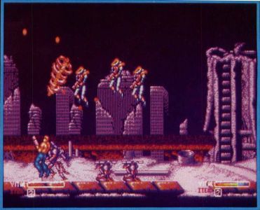 Should being inside a metal shell seem cowardly, feel free to lake on the entire eight worlds laid barren by the evil BIOS. Forgotten Worlds (U.S. Gold) requires that you, and a companion if desired, wipe out all of the "caretakers" that BIOS has left on each planet so that the people of the galaxy can get on with business as usual. It sounds like a good deal to you, since who would expect much smarts out of a character that looks like a punker who kissed a high-tension wire? Anyway, this means flying in all directions, shooting in all directions and generally having a great time going after everything that moves. Each world ends with a big baddie to whack. Hopefully, by then you'll have acquired something more powerful than a piddling laser gun.