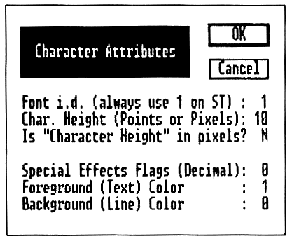 To use TEXTDEMO, pull down the "Display" menu, and select "Char Attributes." The Character Attributes dialogue is shown in figure 1. The first field is the "Font i.d." (as in the vst_font VDI call). Changing the Font i.d. has no effect currently; this option is included for use after GDOS is released (see the "Bug Box" sidebar).