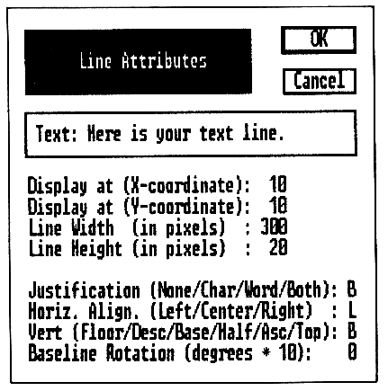 The Line Attributes dialogue (figure 2) allows you to specify a line of text to display (up to 30 characters), and its positioning and alignment. Position is in pixels relative to the display window's top left corner, and is the line's left baseline position.