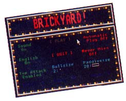 You don't need GFA BASIC to play the game, either--it's compiled as BRIKYARD.PRG. Be sure you've got BRIKYARD.PI1 on the same disk, then double click on BRIKYARD.PRG. When the title screen comes up, click on [Play]. Your mouse will move the paddle from side to side, and you'll get five tries at keeping the ball going as you knock bricks out of the wall.