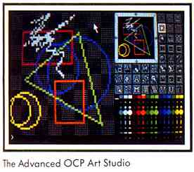 Painting and drawing with OCP are similar to the other packages reviewed here The major difference is screen style and OCP's use of brushes-you can paint with almost anything. Other tools include block functions (copy, move, rotate, resize, etc.), magnify and an antialiaser. Most of these same drawing tools work to create sprites and fonts, both of which can be 16 colors.