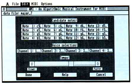 AMI: Moving from the pragmatic to the esoteric, AMI is an introduction to algorithmic music generation. Working from a set of 16 notes, it generates four-part harmonies that can be on up to four different MIDI channels. The nature of the music depends on your choice of notes; several different example data files are included to get you started. This program is highly addictive, simple to use but capable of very pleasing results. It is reminiscent of the old Stereo Chord Egg that PaIA Electronics used to offer.
