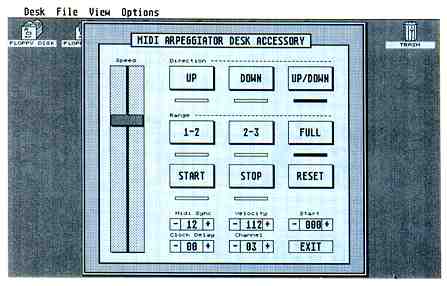 ARPEG: Here is another addictive diversion, a desk accessory arpeggiator. You enter a set of notes from the MIDI keyboard and it runs through them over and over again. Variations are to cycle up and down the keyboard or to go in only one direction. The playback rate is variable over a wide range and can synch to an external clock. If you have access to a hardware sequencer, such as those built into many of the newer instruments, you can capture the notes' data and replay them into your favorite ST sequencer (this also works with AMI).