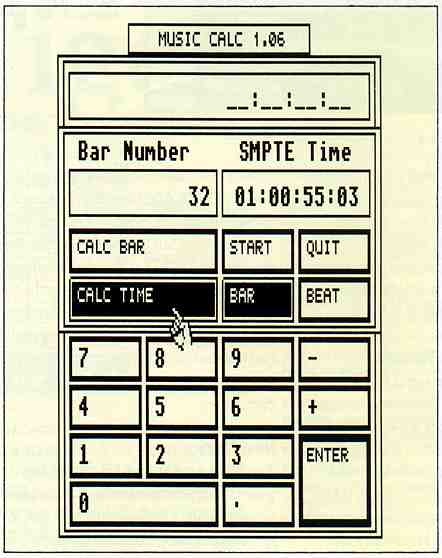 MUSICALC: Ranking high on the specialty utility list is this gem for dealing with several time-related music problems. Given the tempo and time signature, it can convert between bar or beat number and the corresponding SMPTE time (all four SMPTE versions are supported). You can enter tempo directly as beats per minute, or it can be determined by the rate at which you tap the spacebar Delay times for common note durations can be displayed for the given tempo. Other functions include stopwatch mode, 24-hour clock time calculations, metronome and even basic math calculations.