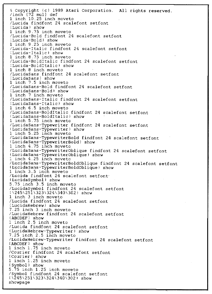 An example of a PostScnpt file is shown in Figure 1. When sent to a PostScript printer, these commands are interpreted by the printer's microprocessor to create an image for the printer engine. Figure 2 shows the file from Figure 1 as printed on an Atari SLM804 laser printer.