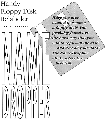 GEM's disk-labeling ability is great. It lets you check the disk's name from the Desktop without taking the floppy out of the drive. It's also useful for cataloging disks; magnetic labeling isn't easily defeated. The only problem with GEM's scheme is that you can't change the label from the Desktop without reformatting your disk. Name-Dropper, written in GFA BASIC 2.0, fixes that limitation.