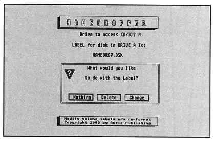Run the Name-Dropper utility by double clicking on NAMEDROP.PRG. The program firsts asks you for the floppy drive, either A or B (no other designators are accepted). It then reads and displays the volume label of the disk in the specified drive and asks if you want to modify the label. If the disk is unlabeled, it says so. If you choose to change or add a label, you'll be asked to supply a new name. Name-Dropper will accept only GEM-legal characters.