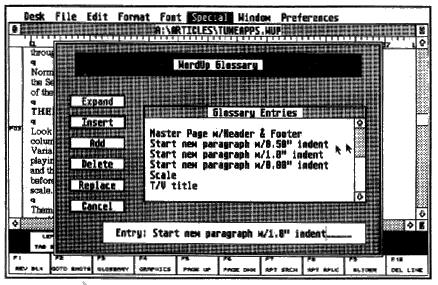 One of WordUp's best features is the glossary, where you define text strings (including font, point size and style attributes) linked to key words, abbreviations or phrases. Enter your text using these shortcut key words. While editing, you can select the key words and automatically replace them with their glossary equivalents. Multiple glossaries are allowed; I use one for scientific writing and another for music/MIDI, and find them to be tremendous time savers. Glossaries can contain pictures and paragraph format controls, as well as text strings.