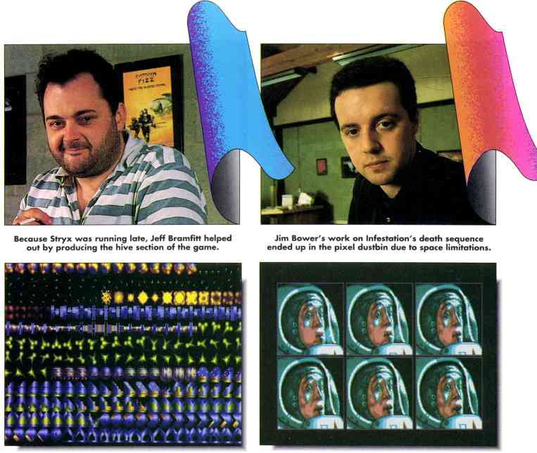 Not all aspects of traditional art training are useful, however. Forget about using paper, unless it's graph paper. Sketching on paper can be deceptive, they warn; you never achieve the same smooth curves and lines on a computer simply because pixels are so blocky. "I only ever use paper when messing around - for throwing paper darts at Jeff and Jim," Corbett says. What a great idea for a game! Art Wars: three men launching and dodging a storm of deadly paper darts. The gameplay will be simple, and since Psygnosis will publish it, the graphics will he spectacular.