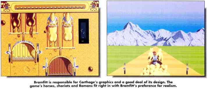 Friendly rivalry exists between the artists. Jeff Bramfitt loathes video digitized graphics and cartoon characters with big feet. He prefers realism to surrealism. For the past year Bramfitt has been designing Carthage, a strategy game set in the Roman era complete with Ben Hur-style chariot racing.