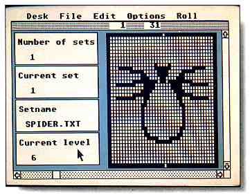 To start designing your own levels, double-click on SSEDT.PRG to run the program from any resolution. The file SSEDT.RSC must be in the same directory. The Screen Editor lets you have up to 10 sets of 30 levels each in memory at once; each level is divided into 40-by-40 units the width of the snakebody. You can cut and paste between levels and fields.