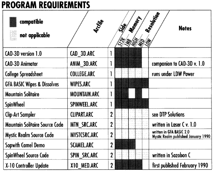 And for you hard-core code hounds Side 2 contains Mountain Solitaire Source Code, in MTN_SRC.ARC, the Laser C version 1.0 source to Michael C. Gilbert's great card game. SpinWheel also was written in C, Sozobon C, to be exact, a public domain compiler written by SpinWheel's author, Ian Lepore. SpinWheel Source Code is compatible with the Laser and Alcyon C compilers. You'll find it in SPINSRC ARC.