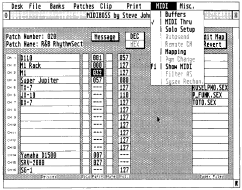 Available memory permitting, MIDIBOSS can hold two patch banks. 520ST owners are restricted to a single bank in memory, preferably using the program in standalone mode. It works well even with a single floppy-drive system and no hard drive. Just dedicate a floppy disk to sysex files, and pop in the disk before selecting any patches that have tagged syex data. An extended-format floppy will hold either three full M1 banks (300 programs, 300 combinations, 20 sequences and 3 banks of global data), 16 D110/D10/D20 banks, or 42 DX7 banks (1344 patches). In this case, a little definitely goes a long way.