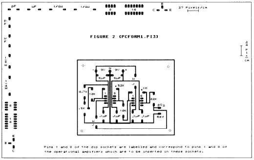 Compare Figures 1 and 2. In Figure 2, the symbols for resistors, capacitors and amplifiers are left out, but the spaces where they are to be soldered in place are labeled. Widened solder tabs are provided which, in the final etched board, are to he drilled so that the components can he plugged in and soldered. Load PCFORM1.P13 or PCFORM2.P13 and use a magnify mode (Fl key in DEGAS) to examine the pixel spacing in some of the PC patterns.