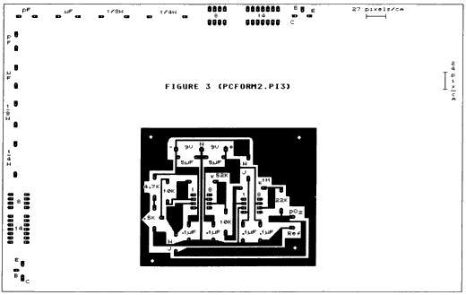 In addition to resistor and capacitor spacing patterns, the margins of the disk files contain patterns for 8-and 14-pin dip sockets, and for a standard-size transistor (labelled E, B, C for emitter, base and collector). There are also millimeter rulers for horizontal and vertical measurement. These can be used to make your own patterns for other electrical components of different sizes. To do this, for example. for a large capacitor, measure the distance between the leads with a real millimeter ruler, and add tip the total number of pixels this equals on the bottom (horizontal) or left (vertical) side of the appropriate screen ruler. When you have the total for the desired orientation, magnify a blank part of the PCFORM3.P13 screen. Now use the mouse to draw an assembly of pixels forming one solder tab, then draw a straight line away from this tab, counting the pixels as you go. When you reach the required distance, draw the second solder point. Print the screen and hold the capacitor up to your new pattern. If the spacing is correct, go hack to your screen and erase the counting pixels from between the solder tabs, then copy the new pattern to the margin. The particular pattern spacings shown here are customized for a Panasonic 109 ii printer. If you have a different printer, you may have to adjust the pixel spacing.