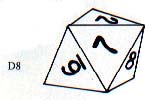 D8 is an octahedron, with eight sides numbered 1 to 8.