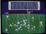 Play is displayed on a split screen. The top half represents the full field of play, with colored dots indicating positions of players and the ball. The bottom screen animates all the players within a certain distance front the ball, an image similar to a wide-angle TV picture. Within the confines of the called play, the human player can vary the action, including selection among four possible pass receivers after the ball is snapped.