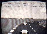As the Atari blimp passes overhead, you begin the gnme by attempting to qualify for the race. Your point of view is located at eye level, immediately behind your car. You slam down on the gas and begin the race along a realistic scrolling raceway with a mountain landscape in the background. You are now attaining speed (maximum 195 mph) and cruising along the straightaway. Pretty soon, you encounter a car just up ahead and you swerve to the right to pass it. Oh no! You lose control of your car and run off the track right smack into a billboard! Valuable seconds tick away while you get your car back onto the track to continue the race to the finish line. To qualify, you must place among the top eight cars (i.e, finish the lap in less than 74 seconds).