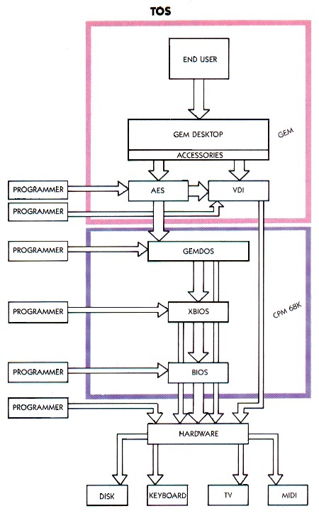 First we group together all of the routines that we have discussed so far – BIOS, XBIOS, GEMDOS, VDI, AES and GEM Desktop. Together this collection of routines can be known as TOS, which stands for Tramiel Operating System.