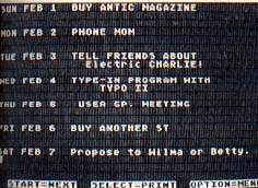 This month's listing is a Weekly Calendar Planner. Type in Listing 1, NEWOWN11.BAS, check it with TYPO II and SAVE a copy before you RUN it.