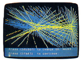 Now you can press any key to switch over to the ''dot" or "bit-mapped" graphics modes. Here, the program plots the course of a bouncing, rotating line. After each bouncing line is drawn, you may press the [START] key to draw another bouncing line, or press the [SELECT] key to move to the next grraphics mode.