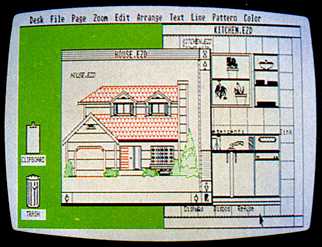 Changing your drawing tool is simple. When you press the right mouse button, the tool menu appears on the screen wherever your mouse pointer is located. Point and click, and you are using a different drawing tool. The left mouse button also controls sizing. The right button selects between modes and pastes down figures you have drawn. You can have two windows open at once so that you are working on two drawings, which can be saved or printed separately. There is a clipboard for saving shapes temporarily, and a trashcan for discarding shapes you no longer need.