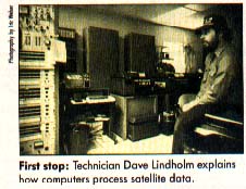 And yet another room full of equipment, where meteorologists buzz around interpreting the satellite photos and making forecasts. Clouds swirl around the earth on huge video monitors. Pettyplace demonstrates weather service photos on a screen controlled with a trackball. He flips the ball, and zooms in again and again for a closer view of a coastline.