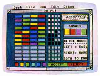 First type in DEDUCT.BAS, checking with ST TYPO, and SAVE a copy before you RUN it. Load ST BASIC and click on BASIC.PRG. Then load DEDUCT.BAS and click on "Run" in the appropriate window. This calls up a low-resolution color screen that interacts with the user via the mouse. (Sorry, Deduction does not run on the ST's high-resolution monochrome monitor.)