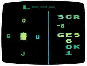Four letters approach your base from above, below, left and right. At least one of these letters might fill a blank. Just point the joystick handle toward your guess-don't press the trigger button. If you guessed right, the letter you blasted will fill each blank where it belongs in the word. Each correct letter scores two points, but a wrong guess deducts two points. If you think that none of the four letters in a turn are correct, press the joystick button to pass without a wrong-guess penalty. Holding down the joystick button also lets you pause the action and think a bit, before the next quartet of letters descends upon you.