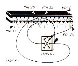 Bend up pin 20 on both OS chips. Piggyback one on top of the other, soldering together all the pins except 20. Plug the chips into the motherboard. Run a wire from pin 20 of one chip to one of the poles (center connectors) of the switch. Run a wire from the pin 20 on the other chip to the other pole of the switch. Run a wire from pins 22 (which are soldered together) to one of the corner connectors on the switch and then continue it to the opposite corner.