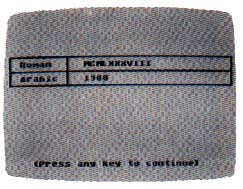 Type in Listing 1, ROMAN.BAS, check it with TYPO II and SAVE a copy before you RUN it. At the prompt, simply type in either a Roman or an Arabic numeral, then press the [RETURN] key. Whichever type of number you entered, the value will now be displayed in both its Roman and Arabic forms.