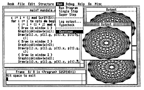 The single-step way of running your program is very useful for debugging. Each time you single-step, one line of your program is executed. Of course, this can be quite time-consuming, especially if you have a loop which sets 1000 elements of an array to zero. To get through this loop, you would need to single-step 1000 times! To avoid this problem, there is the "super step." Once you have ascertained that a particular block of code is not the problem, you can use the "Super step" command, which executes a whole block (a loop, for example) of code at once. This would take care of the problem above very nicely. Or, you could set the program to stop executing at a certain point (set a breakpoint) and single-step or super-step from that point on. Debugging is considerably easier with this package.