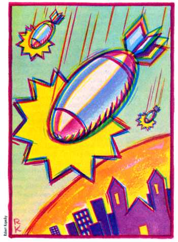 The evil Commander Bardrudius failed in his efforts to enslave the people of Earth, so he decided to destroy it city by city. Bardrudius has ordered his sub-orbital shuttles to tow massive racks of pneumonium bombs across the sky and drop them.