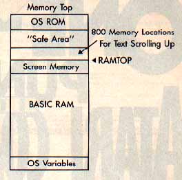 This situation is even worse if you allow your screen to scroll up. Did you ever wonder where the old text goes when you LIST and the text flows up the screen? Yep, into the 800 memory locations above RAMTOP. That number 800 comes from the 20 lines of the screen times 40 characters per line.