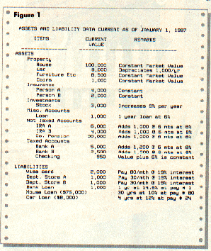 Sstart out by using your word processor to make a table of your assets and liabilities. Figure 1 shows the January 1, 1987 table for a fictional couple we'll call Tom and Betty.