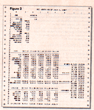 For example, Figure 3 shows NETJULY.SC, the updatad file for July 1, 1987. First, Tom changes the current date shown in cells I29, 134, 133 and I44 to JUL 1, 1987. Next, he adds six months to the current loan payment number for the house and car loans (shown in cells B8 and B15) to 86 and 30 respectively.