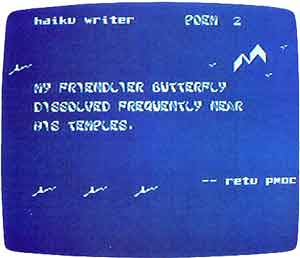 Two programming devices were used to add variety to the computer's output—RND (BASIC's random command) and a type of bank switching. Because of RND the program can choose randomly between different formats for a poem's structure. Sometimes it starts with an article, sometimes with a noun, sometimes it modifies these words with adjectives or constructs phrases that will modify. This creates a free form of verse, reminiscent of the works of great haiku poets such as Basho, Issa and Shiki.