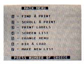 The Main Menu offers seven choices --Find & Print, Scroll Or Print, Print Labels, Screen List, Change Menu, Dir & Load, and Make New List. Each is selected by a single keystroke.