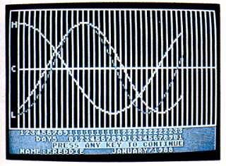 You can also [P]rint out that month's graphs on virtually any printer-even a daisywheel. The chart is created from patterns of different letters and symbols. You can trace the curves with different colored markers to make the finished chart easier to read.