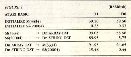 Turbo BASIC is somewhat faster than Atari BASIC for the floating-point routines. Reading into S$ from RAMdisk or writing S$ to RAMdisk takes only four tenths of a second in Turbo BASIC! If the string is a little smaller, such as 8,138 bytes (the size of a GRAPHICS 8 screen & display list) the read and write times are less than two tenths of a second. Reading or writing a GRAPHICS 0 screen (992 bytes) to or from RAMdisk takes one tenth of a second.