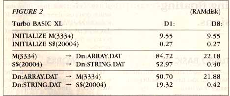 Turbo BASIC XL has %GET and %PUT commands to read and write numeric data to and from disk, and BGET and BPUT to read and write string data to and from disk. Substituting these commands for the Atari BASIC commands in Listing 2 will give you the run times listed in Figure 2. The Turbo BASIC commands and their Atari BASIC equivalents are in lines 630-640, 730-740, 1070-1080 and 1200-1210.
