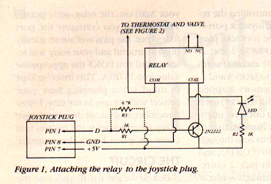 When you turn on your Atari, each pin has +5 volts. If your project is plugged into the jack when you turn your Atari on, the relay will operate. Then, when you configure the port for output, the pins will automatically drop to ground and your relay will release until you POKE the appropriate value into PORTA. This must be kept in mind when planning how your project will operate. In my case, I must remember to shut off the water valve in my greenhouse or the misters will come on when I start the program.
