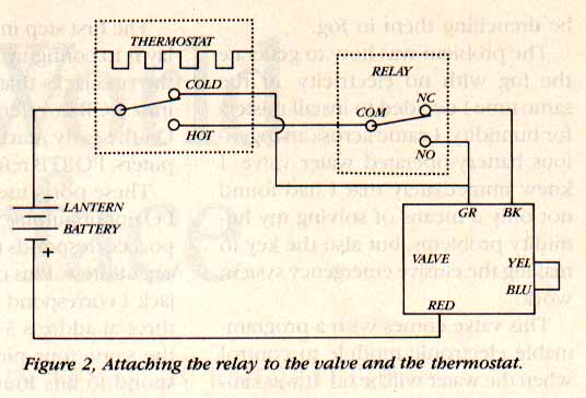 The lead from the negative side of the battery first hits the thermostat, assuring that the valve will stay closed until the air temperature in the greenhouse is high enough. (see figure 2)