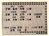If all this sounds confusing, don't worry--the computer does all the scoring for you, telling you each time what the points are for. Arrows point to the cards involved, and a message flashes at the bottom of the screen, such as "PAIR FOR 2" or "15 FOR 2". It's an excellent way for beginners to learn the scoring system. (Experienced players will probably want to speed up the game at the first screen, since they don't have to worry about following the scoring.)