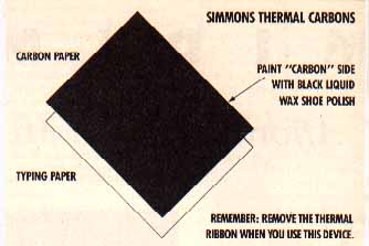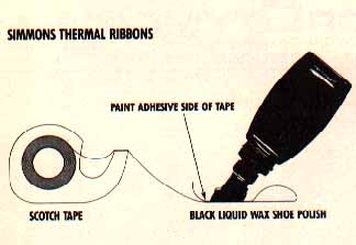 When you print, the thermal pins of the dot-matrix momentarily heat the smooth side of the tape. This heat melts the black wax of the shoe polish, which immediately transfers to the typing paper. The result is permanent and waterproof, producing a high quality, non-smear printout! Try it, and you'll quickly be convinced that my Simmons Thermal Tape idea is pure genius, or pure Shinola, depending on the type of shoe polish you use.
