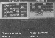 Each player is outfitted with a disintegration pistol that has a maximum of four shots. To fire, move the joystick in the direction you want to fire and press the button. Pistols can be used to blast through walls, or to blast the other player. A player who is hit goes immediately back to home base. If the player was carrying a flag, it will be dropped where the player was hit.
